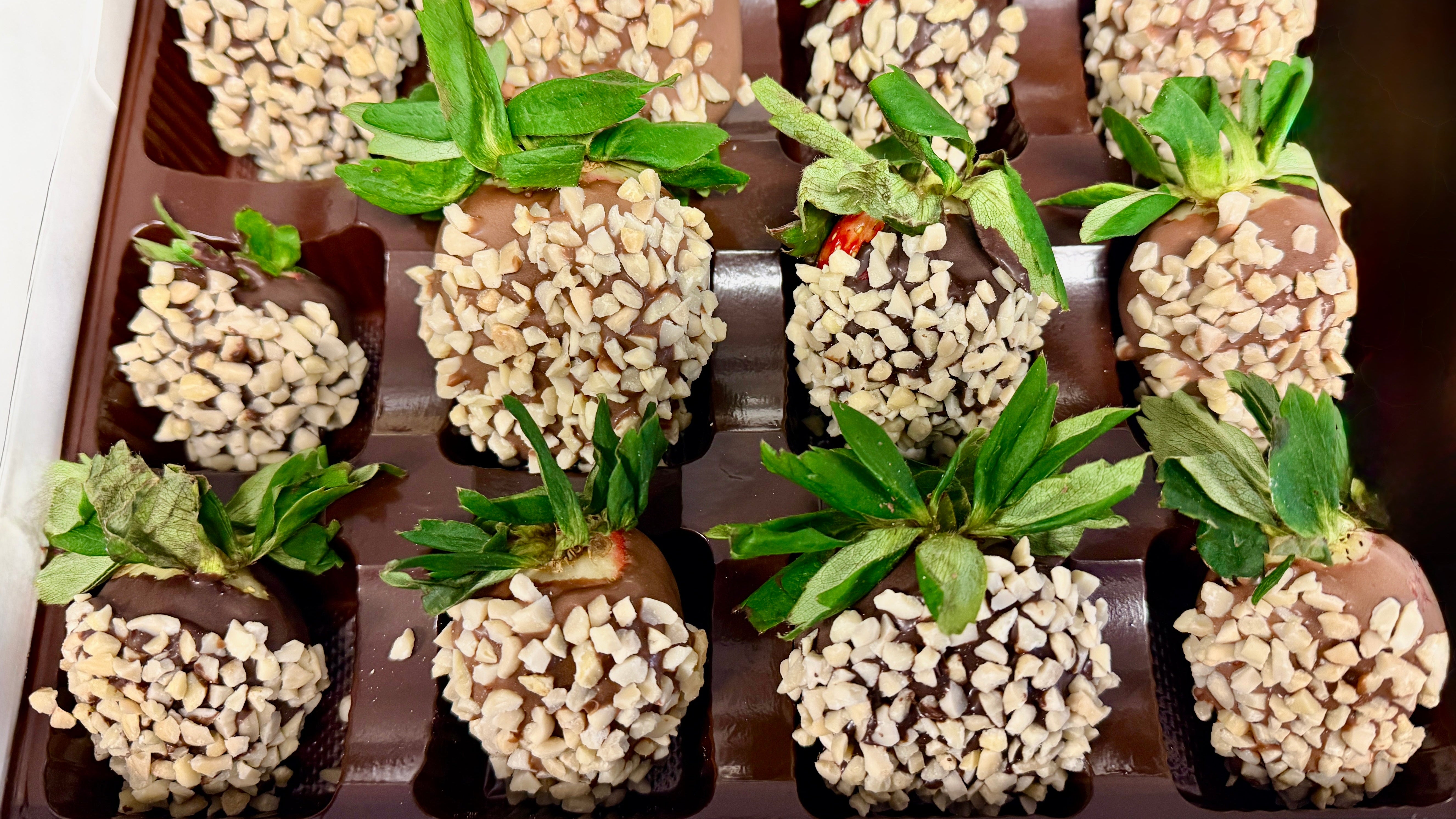 Indulge in the pinnacle of gourmet dipped strawberries with our exquisite creation. Fresh strawberries are carefully hand-dipped in rich, chocolaty confection and topped with savory almonds.