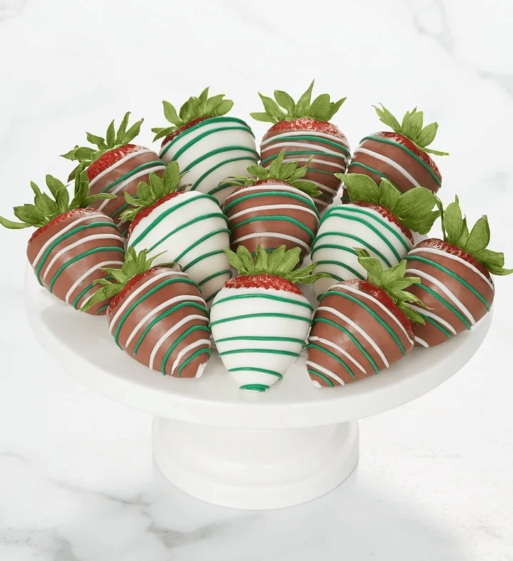 Strawberries dipped in white chocolaty confection with green chocolaty drizzle; dipped in milk chocolaty confection with white & green chocolaty drizzle