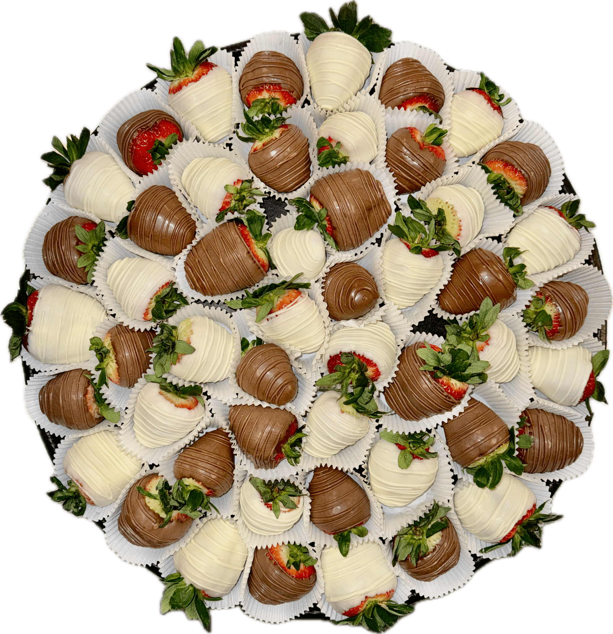 A platter of 50 of our delectable chocolate covered strawberries, expertly dipped and drizzled to absolute perfection.