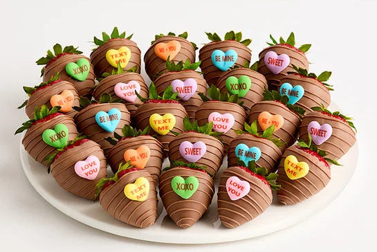 Express your affection with our Talking Hearts Chocolate Dipped Strawberries—a sophisticated twist on Valentine's Day romance. Each plump, fresh strawberry is enrobed in smooth milk chocolate and adorned with charming sugar decorations mimicking beloved Conversation Hearts.