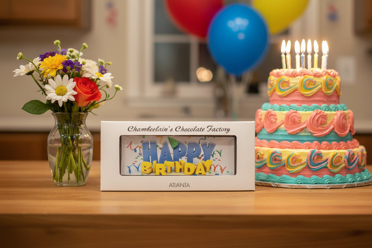 This large chocolate bar features an edible design for that great birthday person. Choose from one of two designs, to make it a unique and tasty treat for any chocolate lover. Available in our milk, white, or semi-sweet chocolate. 7" by 3.25"