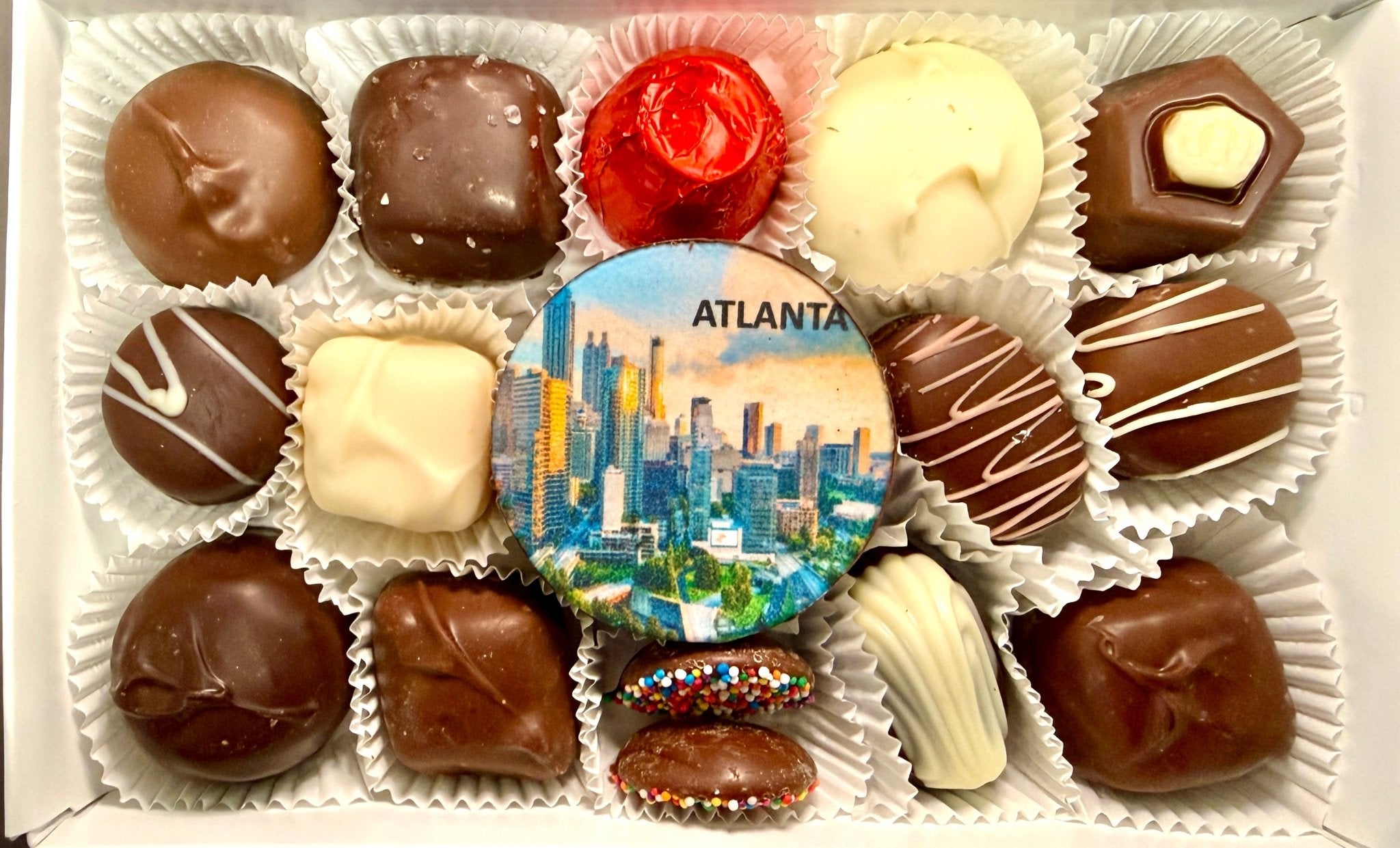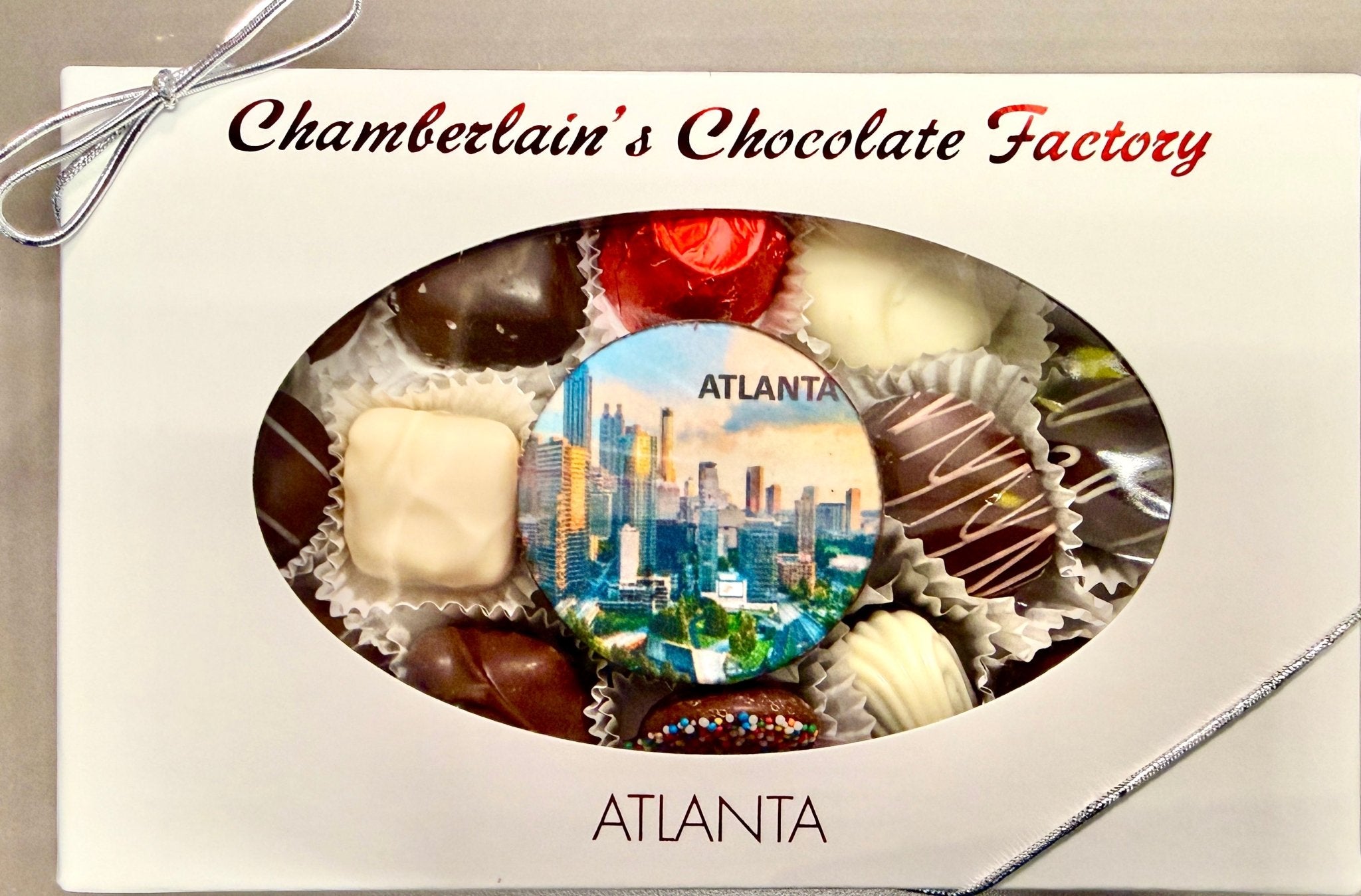 The centerpiece of this gift is an Oreo®️Cookie coated in rich chocolate and featuring a delightful Atlanta Skyline image that is entirely edible. Surrounding this are a variety of chocolates, including butter creams, caramels, and fruity flavors.