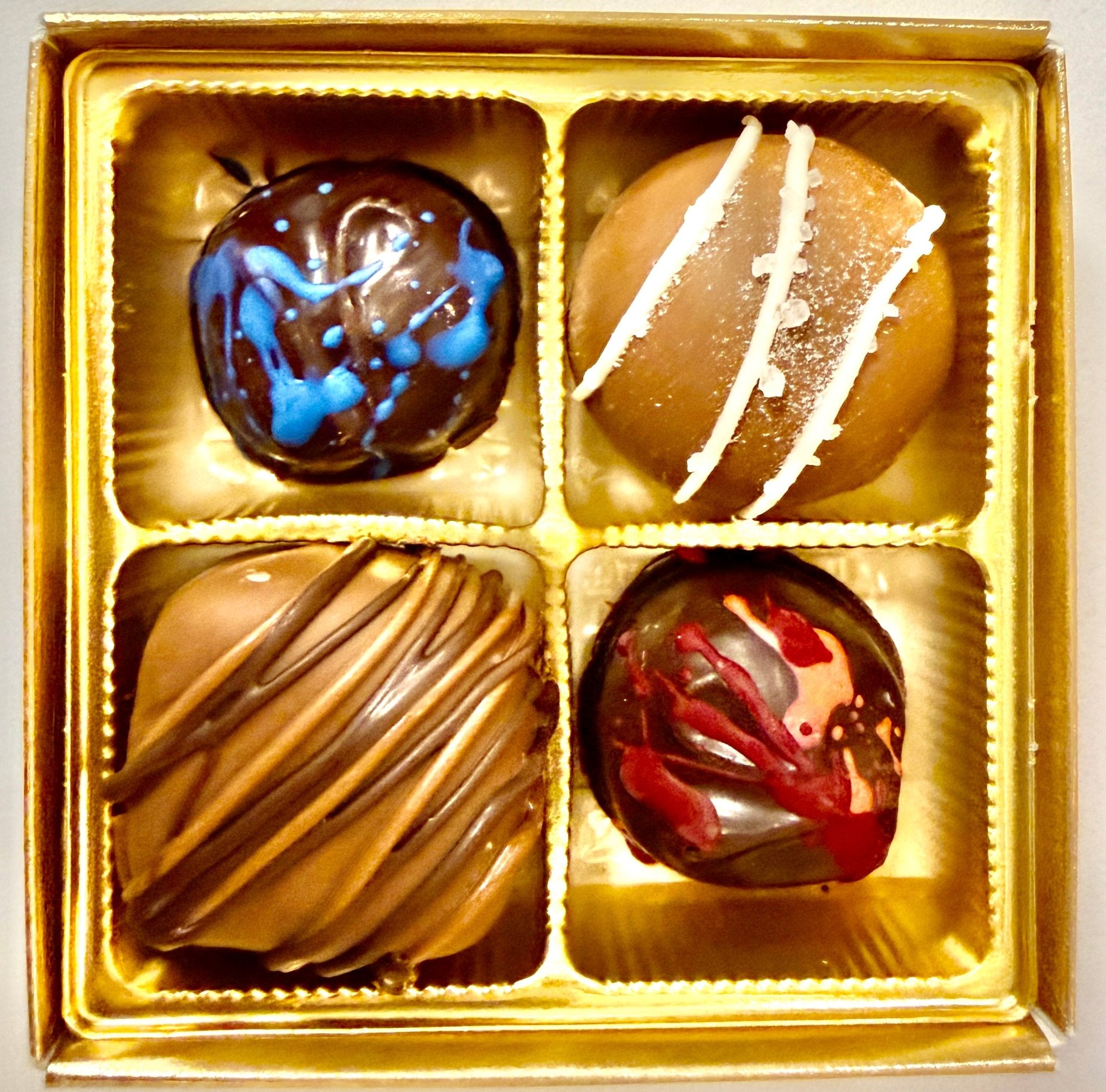 What a sweet combination! This duo includes 4 pieces of our famous Hand Made Chocolate Truffles, in a beautiful box, hanging attached to an 8.4oz bottle of Martinelli's Sparkling Cider. Truffle flavors will vary based upon what's most fresh!