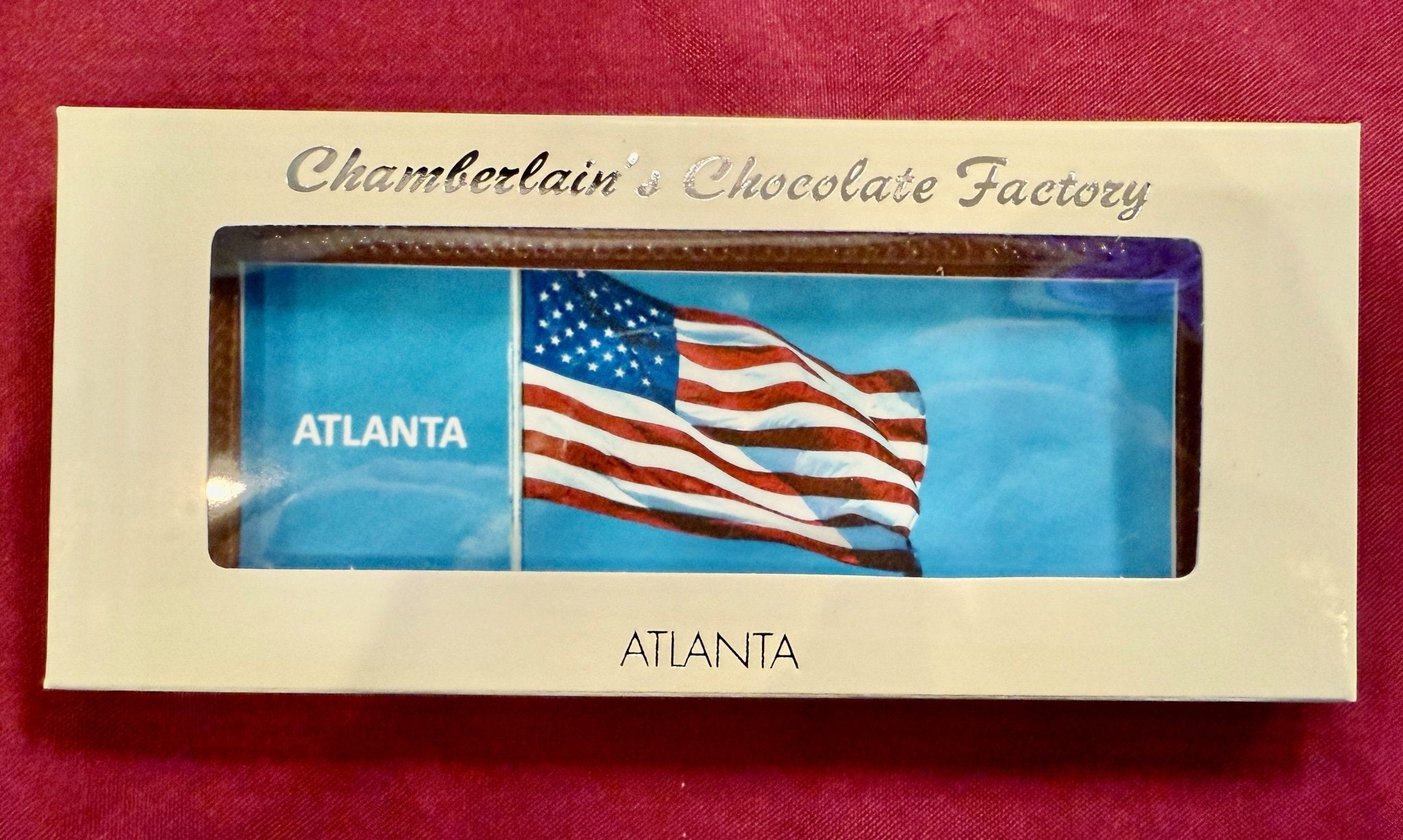 This large chocolate bar features an edible design of the American Flag, making it a unique and tasty treat for any chocolate lover. Available in our milk, white, or semi-sweet chocolate.